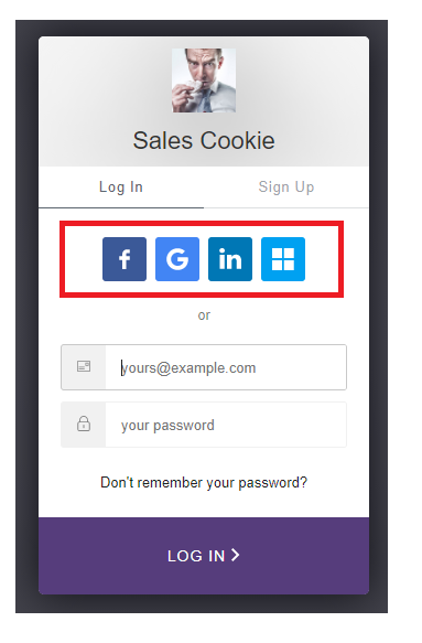 When you log in or sign up for a Sales Cookie account, you have the option to login with Microsoft, Google, LinkedIn, etc. Or you can enter an email address and password.