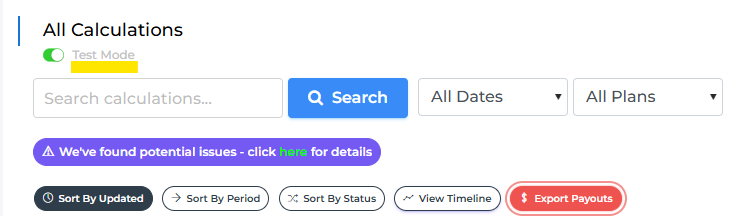 When exporting payouts / running reports / viewing dashboards with test mode enabled, keep in mind that amounts from test calculations are included.