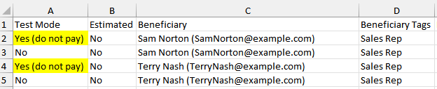 In the example below, the payroll export indicates that some amounts should NOT be paid, because they originate from test calculations.